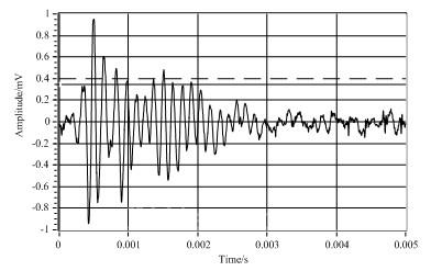 经过滤波后的连续采集信号送入一个幅值检测器,根据设定的幅度阈值和时间长度,从连续信号中截取出突发性声发射的波形数据(图3为滚动体表面缺陷的轴承在运行中产生的突发性声发射波形),再对每个波形数据进行振铃计数、幅度、频率、能量、上升时间、持续时间等特征参数计算,并存入一个声发射特征参数表格中,供直接查看以及进一步的统计分析。检测出的声发射波形数据可以文本文件的形式存盘。波形数据的存储和连续数据存储的功能是独立的,即两者可以同时存储,也可以只保存一种。