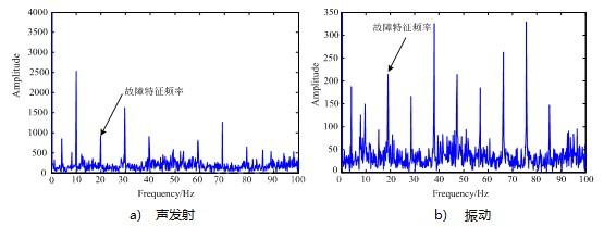 为了检验该声发射测试系统功能的有效性,在QPZZ-Ⅱ旋转机械振动及故障模拟实验台上,对滚动体故障的轴承进行了声发射与振动信号的对比测试。故障轴承型号为NU205,节圆直径39mm,滚动体直径7.5mm,滚动体数目12,接触角0?。通过线切割在滚动体表面加工出一微小缝隙来模拟表面材料疲劳剥落造成的缺陷。转速为570 r/min,即转频为9.5 Hz。计算可得滚动体通过频率为18.3 Hz。