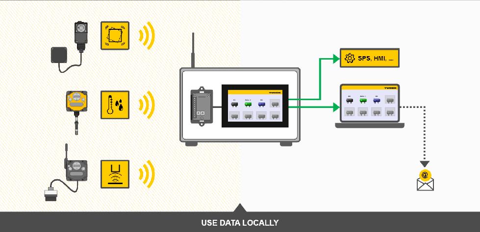 在机器环境中,传感器监测各种不同的参数,例如振动、温度和湿度。通过使用超声波传感器,甚至可以检测填充液位。专有的DX80无线系统的传输模块可以将数据传输至关联的网关。通过连接TX700 HMI控制单元,维护工程师可以集中查看所有状态数据。