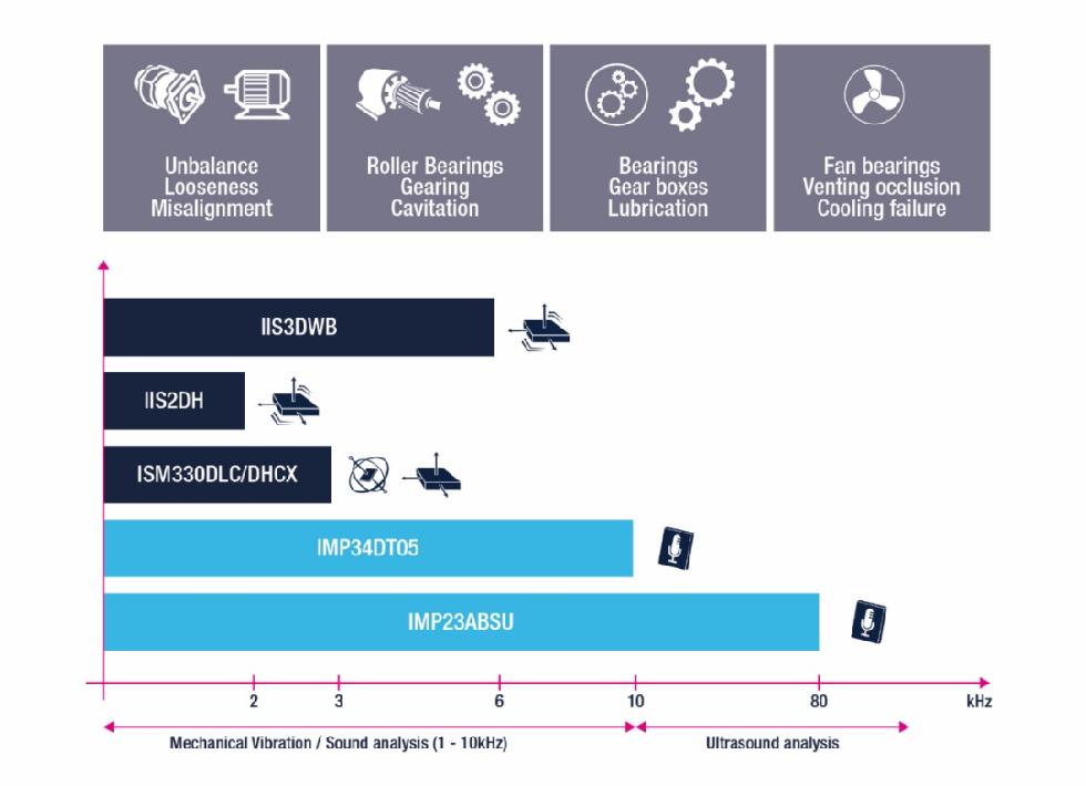 手头有了数据分析工具后,下一步就是选择合适的传感器:a) 根据一中发现的重要参数选择传感器类型意法半导体提供加速度计、陀螺仪、磁力计、振动传感器、传声器、压力传感器、湿度传感器、温度传感器、激光传感器、红外传感器等各种传感器。工业级传感器通常提供更高的性能和精度、更好的温度和时间稳定性,甚至提供产品生命周期保证。