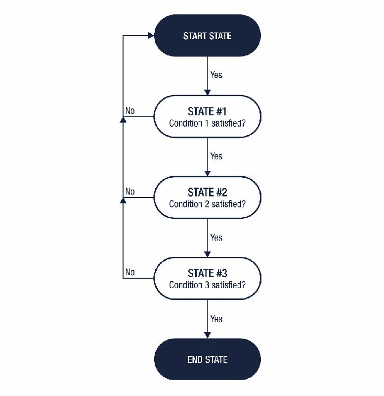状态机是用于设计逻辑连接的数学抽象方法(图10)。FSM 是一种由预定数量的状态和状态之间的转换组成的行为模型,类似于流程图。传感器可以设为用户定义模式一旦满足,就立即生成决策标志。为了便于实现决策功能,意法半导体有些传感器嵌入了16 状态机。
