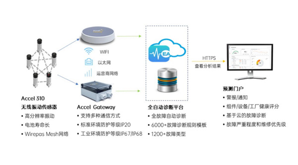 虹科无线振动监测系统中硬件之间数据的传输采用Wirepas Mesh网络,保证了数据安全性和可靠性。传感器打开后可自动连入到现场网关,网关通过配置网络(WiFi,以太网,蜂窝)后可连接到云服务器。根据Wirepas Mesh网络特点,传感器还可以作为中继节点,使用此设置,传感器将不会收集振动数据,而只会在低功耗状态下运行,以桥接与最近网关的通信。
