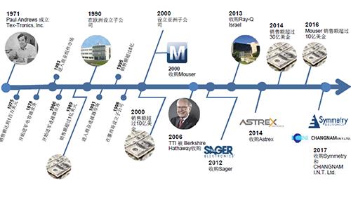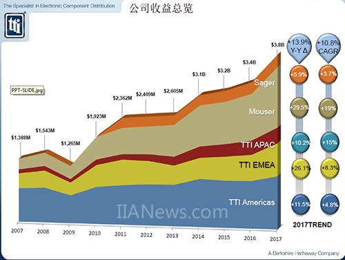 TTI是作为电子产业的分销商,是有Paul Andrews在1971年创立,拥有近40年的发展,在2000收购了著名的mouser,2006年TTI又被股神巴菲特所收购,在2016年Mouser已经销售额超过10亿美金,而TTI的销售也达到了40亿美金,其中最大的部分来自美洲,其次是欧洲、亚洲。其中亚洲占到全球收入的11%。为了能够更稳健的发展,在亚洲TTI收购了两家公司,一家是做汽车连接器,另一家是做手机产品,也是为了货源的更加稳定。