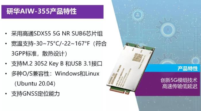 研华AIW-355采用Snapdragon X55 5G调制解调器,并在5G独立 (SA)和非独立(NSA)操作中支持5G NR SUB6频率。此外,其兼容LTE和WCDMA标准,并向后兼容LTE-A和3G网络。AIW-355有助于优化5G建设初期客户投资,满足新兴市场需求。