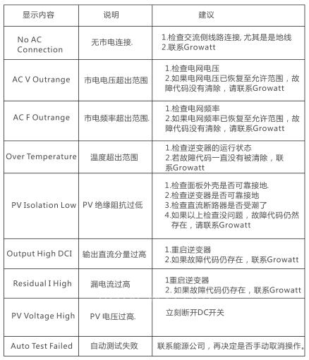 通过警告(W)可识别Growatt光伏逆变器的当前状态,警告不涉及故障。当(W)出现在显示屏上后,它表明一个警告代码,通过光伏逆变器有序的关闭/重新设置或者进行自我纠正可被清楚。(W)的码如下表所示。