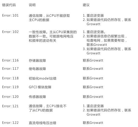 错误代码表明一种可能存在的设备故障或是光伏逆变器设置或配置不正确,只有专业的操作人员才可以试图去更正和清除错误。一般的错误代码只要故障消失是可以清除的,但有一些像表格下方列出的错误代码可能是清除不了的,可以通过联系供应商更换新的光伏逆变器。