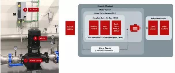在下面的图片中,我们有一台水泵,它由一台用变频器控制的电机驱动。把这个翻译成IEC 61800-9语言,即为水泵是被驱动的设备,电机和变频器是电力传动系统,并且变频器是一个完整的驱动模块(CDM)。
