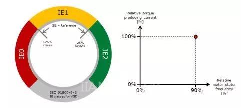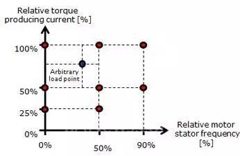 可以看出,与变频器操作点相比,存在细微的差别:对于电机驱动系统,右边的两个点是在100%转速和50%/100%负载下定义的。对于变频器,右边的两个点是在90%定子频率和50/100%负载下。