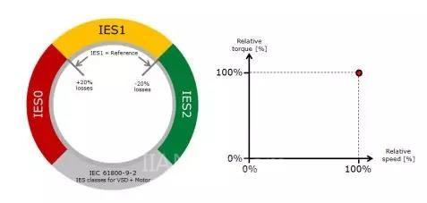 关于电机驱动系统同样也有有三个等级类:IES0,IES1 和IES2。“IE”后边的“S”代表“系统”。IES1是参考等级。与变频器不同,对于系统来说,等级的“宽度”是+ / - 20%。这意味着,如果损耗低于参考值达20%,那么等级变为IES2。IES等级是在额定负载和额定转速下(100% / 100%)确定的。