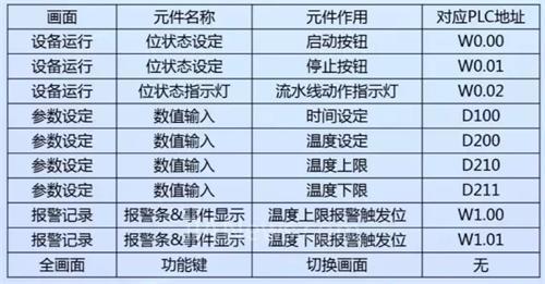 完成了触摸屏的基本画面设计,最后我们一起来认识下画面中需要使用到的元件,以及它们对应PLC的地址分配。