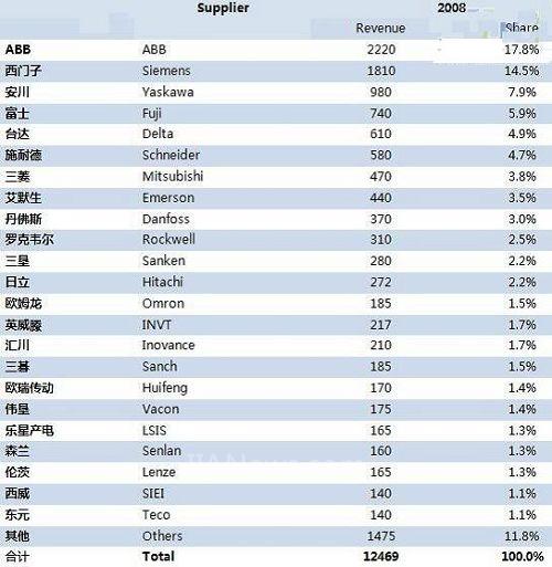 在高端,一般我们指两类产品。一是应用在钢铁、水泥等行业的大功率变频器,譬如ABB的ACS800和西门子的工程型变频器。二是机械类应用的高端,即提升类负载,主要指起重和电梯,主要供应商如ABB,Siemens和Yaskawa。实际上到这里已经能够看出,在高端市场中,供应商数量并不多,主要厂商仅为上述三家,份额集中。从另一方面也表述了一个观点,如果市场覆盖仅仅为中低端市场,则很难突破5-6%的市场份额,上升到10%及以上第一集团的位置。