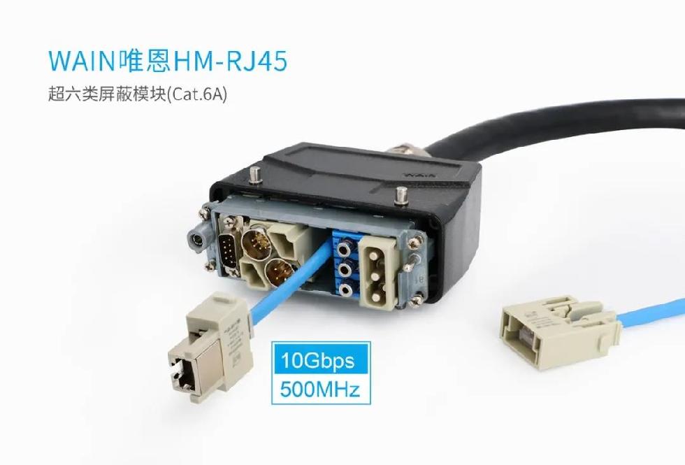 WAIN唯恩HM-RJ45超六类屏蔽模块(Cat.6A)采用金属外壳锌合金+ UL94V-0热塑性材料,可适用于模块框架,与其他模块同步应用,实现数据、信号、电力的完美整合,搭配WAIN唯恩IP67外壳,坚固耐用,特别适合用于要求严苛的工业电缆应用,如控制柜、电机/电机控制、机械和机器人技术等。