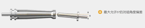 因为市场上电动汽车充电座多采用片簧插针技术,但此技术允许充电枪插入角最多为1°,超过此偏差角则有损坏片簧体风险,结果是接触电阻大增,充电时温度升高,进而损坏充电系统。 而ODU采用了自己研发的开槽式端子技术,允许充电枪插入偏差角达±5°,保护了插针和充电系统,并且耐恶劣环境,保证可靠传输,性能稳定,机械寿命长。