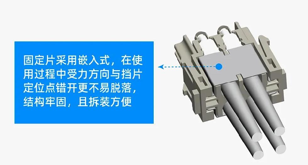 5. 固定片采用嵌入式,在使用过程中受力方向与挡片定位点错开更不易脱落,结构牢固,且拆装方便