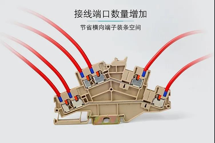 2.设计采用双层型结构,每一层都可以实现一进两出或两进一出的接线功能,与传统单层一进两出型端子相比,增加了接线端口数量,可节省横向端子装条空间;