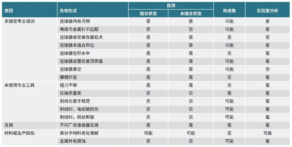 缺乏关于eBOS部件及其与光伏系统长期成功的关联性的知识,极易导致eBOS部件失效,继而造成较高的运维成本和电量损失。下表列出了在日常运维过程中,针对各类失效原因及形式的检测方法。