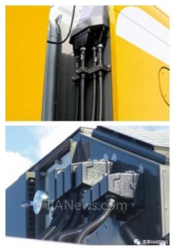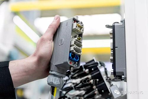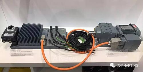 这是一个西门子的分布式驱动产品,左边的驱动器和右边的马达是通过一个橘色的线缆连接起来的,线缆的两端采用的是浩亭的连接器。可以设想一下,如果不采用连接器,采用固定线缆连接的话,左右两边的设备不但间距被固定死,而且如果一旦需要搬动或者运输,得两个设备一起搬,极其不便。而采用连接器来连接,两个设备便可以分开包装运输,随时拆分,相当方便!