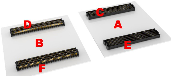 为了说明这个问题,请考虑使用一个多夹层连接器系统(图2)。该项组装包括六个或更多组件:主板(A)、夹层卡(B)、母头连接器#1(C),与配对的公头连接器#1(D),母头连接器#2(E)与公头连接器#2(F)配对。