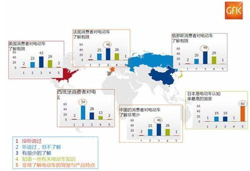 和大多数受调查国家一样,在中国人们几乎对于电动汽车没有太多的认知。大多消费者只是听说过电动汽车但缺乏深入的了解。相对而言,日本是唯一的一个对电动汽车具有较高的专业知识和经验的市场。在日本大约60%的汽车用户对电动汽车非常了解,这样的比例远远高于中国(1%)和及其他欧洲国家和美国。