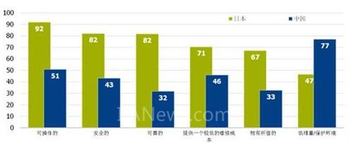 对比日本市场,大多数中国消费者对电动汽车的利益点还是保持一个非常模糊的认知,通过下图(二)看出,目前仅仅是停留在一辆能够保护环境的产品上,很少有消费者认为电动汽车是操作简易、安全驾驶和质量可靠的产品。与此相反,在日本,大多数汽车用户对电动汽车持有一个积极的态度。关键的原因是日本用户认为电动汽车与自己的切身利益密切相关,他们也在很多程度上相信电动汽车是容易操作的并且安全可靠的。