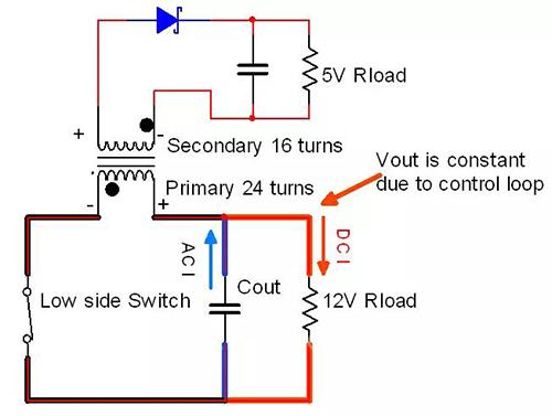 如图 2B 所示,当低边开关导通时,电路变为简单的半调节反激电路。初级绕组为 24圈,电压为 12V / 24 圈= 0.5V / 圈。