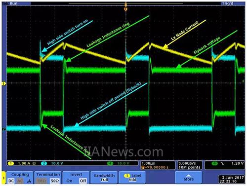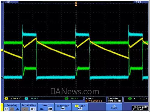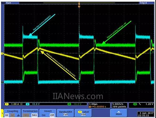 反激绕组对电路工作的作用是使电感低于标称值。以下是示波器显示的各种波形 (电路网参见图 3,波形描述参见图 5)。