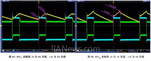 图6. 45VIN 处隔离+5 满载 (1A) ,主 +12 0.2A 时的波形