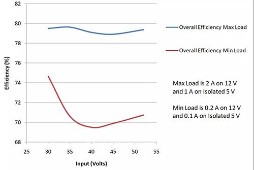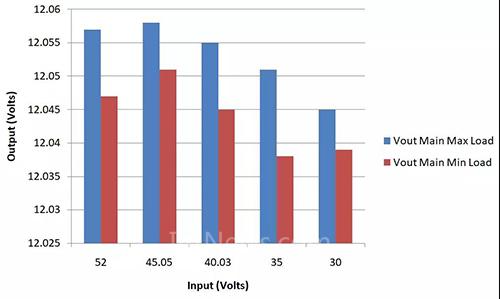 反激绕组 C18 两端 DC 输出电压没有得到很好调节。32V 至56V 输入范围内可实现约10% 线性调整。但是,如果输入总线 VIN 范围不如本设计例宽,实现 3% ~ 4% 线性调整对于应用目的来说是比较合理的。如果线性调整要求更严格,或者在更宽的输入电压范围内需要更好的性能,可以使用开关稳压器 ( 图2 中的 U10 ) 抑或线性稳压器。