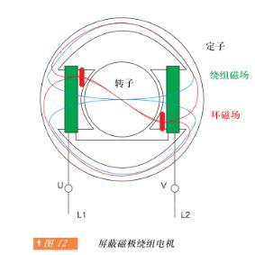 本设备 ( 图12) 用于超低功率驱动电机(大约一百瓦)。磁极带有凹口,将短路导电环插在里面。此设备产生的感应电流会使旋转磁场发生畸变,触发起动过程。