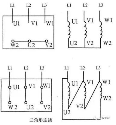 检修或重绕三相异步电动机三相绕组的六条引出线,头、尾必须分清,否则在接线盒内无法正确接线。按规定六条引出线的头、尾分别用U1、V1、W1、U2、V2、W2标注标号(旧标号为D1,D4,D2,D5,D3,D6)。其中U1、U2表示第一相绕组的头、尾端;V1、V2表示第二相绕组的头、尾端;W1、W2表示第三相绕组的头、尾端。不同字母表示不同相别,相同数字表示同为头或尾。检修电动机时,如果六条引线上标号完整,只有接线盒内接线板损坏,可按电动机铭牌上规定的接法更换接线板,正确接线即可。电动机接线方法分为星形(Y)、三角形(△)两种连接方法。如图l所示。如果六条引线上的标号已被破坏或重绕电动机绕组后,就必须先确定六条引线的头、尾端进行标号,然后再按规定接到接线板上。