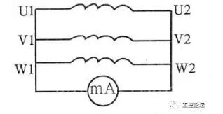 ①万用表置mA档,按图2接线。假设一端接线为头(U1、Vl、W1),另一端接线为尾(U2、V2、W2)。