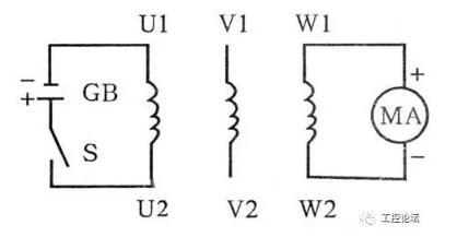 ②闭合开关S,如灯泡亮,表明两相绕组为头、尾串联,用在灯泡上的电压是两相绕组感应电动势的矢量和。如灯泡不亮,表明两组绕组为尾、尾或头、头串联,作用在灯泡上的电压是两相绕组感应电动势的矢量差。