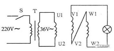 ②闭合开关S,如36V灯泡亮,表示接220V电源两相绕组为头、尾串联。如灯泡不亮表示两相绕组为头、头或尾、尾串联。