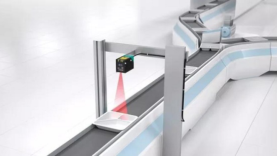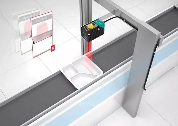 在食品行业中,生产即食食品时, 经常会把一个塑料托盘分成几个小餐格。对于用几种不同配料的食物,例如肉类、意面和蔬菜正确,填充这些餐格是必不可少的。为确保将配料填充到正确的餐格中,必须事先检查托盘是否正确放置。在传统的解决方案中,该任务通常由复杂昂贵的视觉传感器来执行。然而,为了可靠地检测低对比度的物体,例如具有光滑表面的白色塑料托盘,则需要额外的外部照明和复杂的配置原理。