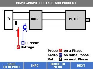 要使用 Fluke Motor Drive Analyzer 开始每个测试,只需根据图表连接测试探针,然后按“下一步”。