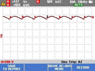 驱动器内部的交流-直流转换至关重要。为获得最佳驱动器性能,必须要保证电压正确、充分滤波并保持低纹波水平。高波纹电压可能说明电容器存在故障或所连接电机的规格不正确。Fluke MDA-500 系列 Motor Drive Analyzer 的记录功能可在承受负载时的工作模式下对直流总线的性能进行动态检查。还可以使用 Fluke ScopeMeter® Test Tool 或高级万用表进行此测试。