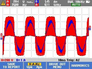 ● 检查谐波失真是否在可接受的范围内。目视检查波形形状,或查看同时显示总谐波失真和单个谐波的谐波频谱屏幕。例如,平顶波形可以指示连接到同一馈电电路的非线性负载。如果总谐波失真 (THD) 超过 6%,则可能存在问题。
