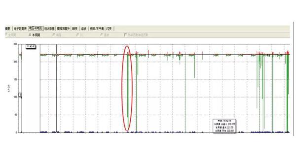 在监测的第6天,变频器又出现了一次突发的停机。通过查看电能质量分析仪记录的数据,能够明显看出在停机的同一时间出现了一次非常严重的电压暂降,降幅接近80%。由此,我们可以确定此次停机是由于电压暂降引起的。