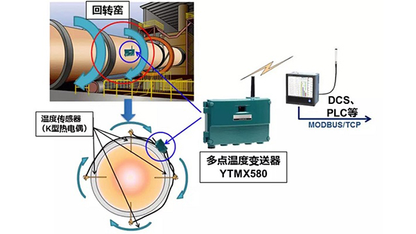 无线温度变送器YTMX580安装于回转窑侧面,K型热电偶的信号通过无线温度变送器,发送ISA100无线信号给无线网关GX20W。无线网关GX20W现场监视并记录各个通道的热电偶信号的变化。另外,无线网关GX20W接收的无线信号还可以通过Modbus TCP传送给其他上位系统,如DCS、PLC等。应用行业包括:煅烧厂、 水泥厂、垃圾焚烧厂、制药、食品加工、化工等。