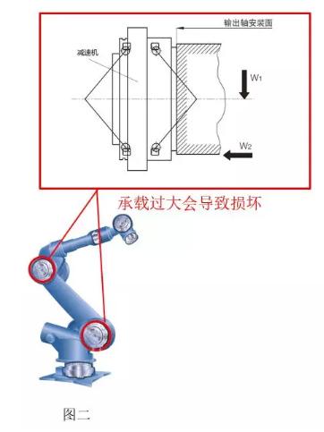 减速机上有时候会承受外部载荷,这种载荷会导致减速机受到一个弯矩与推力。减速机所能承受的最大值就称为“容许力矩”和“容许推力”。减速机在使用过程中应避免外部载荷超过这个值,否则有可能出现图二所示情况:用在多轴机器人上,主轴承承载过大,造成损坏。如图二所示,本条中所指力矩为W1和W2所产生的力矩之和,所指推力为W2。
