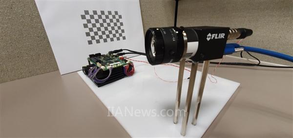 图3:结构光设置,包括DLP产品LightCrafter 4500(左)、灰点前视红外线Flea3相机(右)和校准(后)