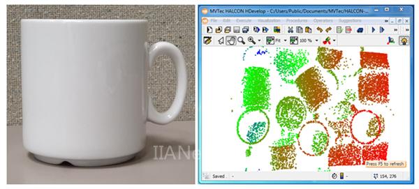 图4:在Halcon HDevelop(右)中显示的箱子中,捕捉到的杯子(左)和由DLP驱动的多个杯子的结构光获取的点云