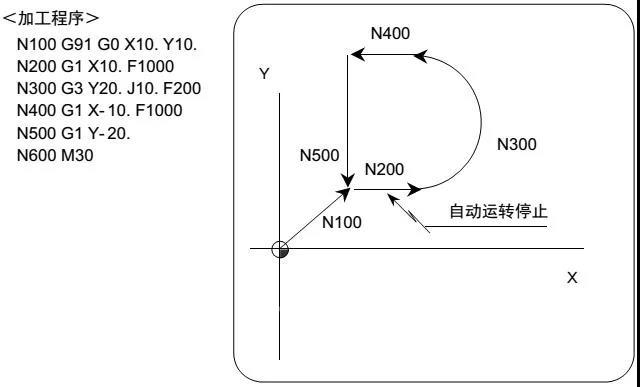 执行到N200程序段时,接通手动速度指令有效信号、手动速度指令逆行有效信号、手轮模式(内存模式保持接通状态),程序自动运行暂停。