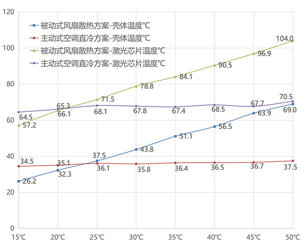 (与传统风冷散热方案在不同温度下激光芯片温度的变化)