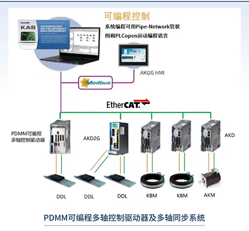 AKD BASIC为单伺服轴应用打开了强大且经济的解决方案的大门,这些应用过去需要额外的高级控制器才能使其工作。AKD BASIC拥有AKD的所有性能和功能,再加上编程语言的简单性和灵活性,在许多情况下,可以灵活替代更昂贵、更笨重的 PLC或其他更高级别控制器。以下两种系统架构展示了PDMM多轴同步控制驱动器和AKD BASIC单轴控制驱动器的使用特点。