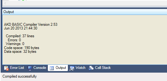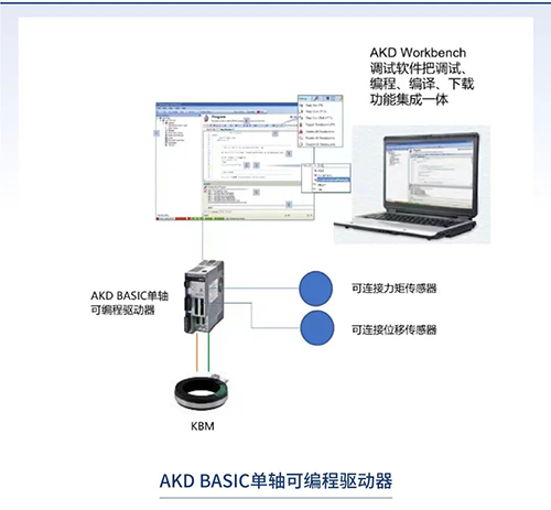 AKD BASIC编程开发无需安装更多软件,其编程接口是AKD WorkBench的一个标准功能,包括自动语法高亮显示、自动完成、自动格式化和代码模板等易用功能,具有完整的编译,运行和调试功能。编程界面还集成了完整的调试辅助功能,可以输出故障信息、编译信息、内存状态信息等。