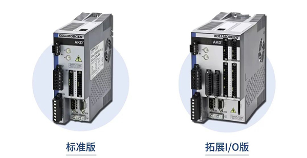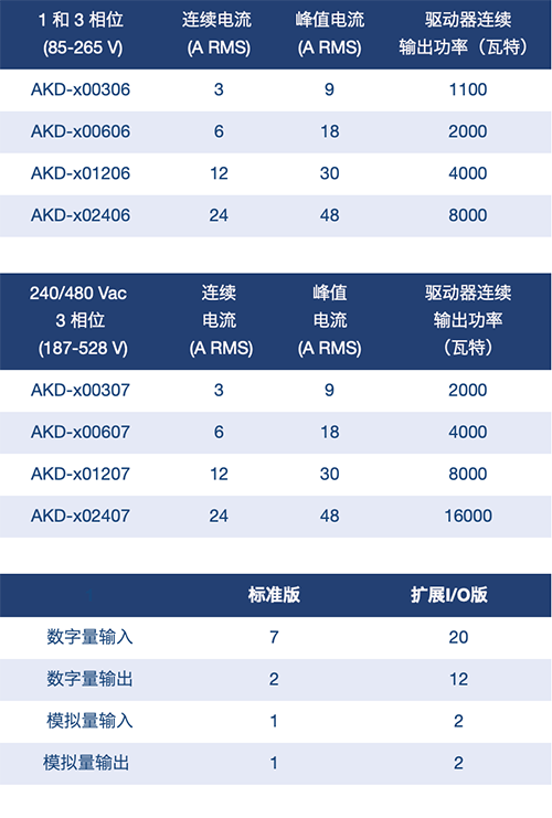 AKD BASIC集成编程功能,可灵活实现单伺服轴的控制功能。硬件版本分为标准版和可支持更多输入输出资源的扩展I/O版。可支持的电流功率型号和板载资源如下表: