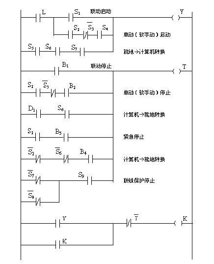 通过对上述控制功能和PLC各个输入输出信号的仔细分析,确定出单台设备的控制逻辑,利用西门子STEP7编程软件编写出梯形图(LAD)程序,见图1。其中,K为控制设备起/停的PLC输出信号,Y为启动逻辑信号,T为停止逻辑信号,由以下信号按一定逻辑关系产生:L ,与该设备有联锁关系的其他设备运行状态;S1,上台设备启动后延时触发信号;S2,转换开关处于计算机控制方式;S3,监控画面单动/联动方式选择按钮,“1”为联动,“0”为单动;S4,监控画面单动按钮;S5,控制方式预转换按钮;S6,转换开关状态,为“1”表示处于就地控制;S7,设备正在运行状态,是中间继电器信号;B1,联动停止信号,由上台设备停止后触发产生;B2,监控画面停止按钮;D1,预转换过程结束信号,“1”表示转换结束,由定时器延时触发;B3,监控画面紧急停止按钮;B4,操作台紧急停止按钮;S8,与该设备存在联锁关系的其他设备运行状态;S9,该设备PLC控制输出状态,为“1”表示PLC控制线路接通。
