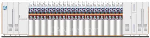 抽气式转杯纺纱系统的主要工作原理为:喂给罗拉以稳定的速度转动 (速度可以调节),将棉条通过喂棉喇叭送入纺纱器中,由喂给罗拉和喂给板通过加一定压力的方式积极握持住棉条,将棉条以恒定的速度输向分梳辊。分梳辊的表面覆有锯齿,这些锯齿通过高速旋转的把形成棉条的束纤维分解成单纤维,这些单纤维随分梳辊向前运动, 在离心力和由风机反转抽气产生的负压形成的气流的双重作用下,一方面将纤维从分梳辊上剥离而送向转杯, 另一方面气流能进一步除去棉条中的杂质。纤维离开分梳辊后沿一条短小的通道通过隔离盘向纺纱杯壁运动。在纺纱杯壁上, 一方面由于纤维的惯性运动,另一方面由于气流在转杯内部造成的负压, 纤维沿着转杯杯壁运动到转杯的凝聚槽。纤维在凝聚槽内被加速到与转杯同样的速度运转, 由于负压和高速回转形成的离心力使纤维在凝聚槽中形成平行排列的须条。正常纺纱时凝聚槽的须条是开环的, 其头端为一段加捻区, 纺制成的纱线一端被引纱罗拉握持,这个头端随着转杯高速回转而被加上真捻, 捻度随着纱线向凝聚槽的须条传递, 不断地形成新的纱线。纺制成的纱线通过假捻盘和引纱电机驱动的引纱管转动被不断引出纺纱器,与此同时给棉罗拉送来的纤维又不断形成新的纤维层。新形成的纱线不断被引出,同时新的纤维层不断形成,从而构成一个连续的纺纱过程。这只是抽气式转杯纺纱设备数百个纺纱锭子其中之一的纺纱工作过程,而实际上一台完整的纺纱设备整体结构非常复杂,主要包括车头、车尾和中段三部分,设备总长超过30米。主要电气控制设备和喂给、引纱、分梳、转杯、横动等驱动电机都安装在车头,这也是设备的心脏,车尾主要安装负压风机、落筒和排杂电机等,相当于呼吸与排泄系统,中段一般由若干节结构一模一样的中段机组成,中段机的数量可按照客户要求随意增减,一般都在12节以上,最多时可安装22节。每节上各安装有16锭纺纱锭子和相关的半自动辅助接头机构,这样设备运行后可同时纺纱192锭(12节)-352 锭 (22节),极大的提高了生产效益。