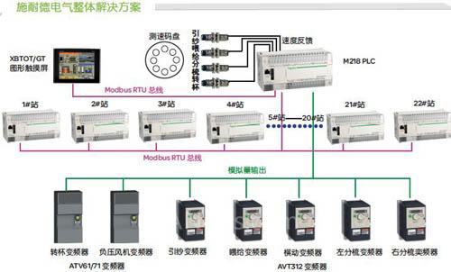 抽气式转杯纺纱设备在车头需要一套PLC主控制系统,而每一节中段机也都需有一套能单独工作的PLC控制系统,而同时这些中段PLC控制系统,又需要与车头主控制系统交换数据,接收车头发来的接头工艺参数及锭长设定值,并将各锭的工作状态及纺纱产量送回车头。而且车头的喂给、引纱、分梳、转杯、横动以及车尾的负压风机都需要变频控制。所以其采用的电气产品也非常丰富,采用的产品涵盖了低压电器产品、自动控制产品、驱动产品、人机对话产品、开关电源产品等几乎所有的自动控制产品门类。